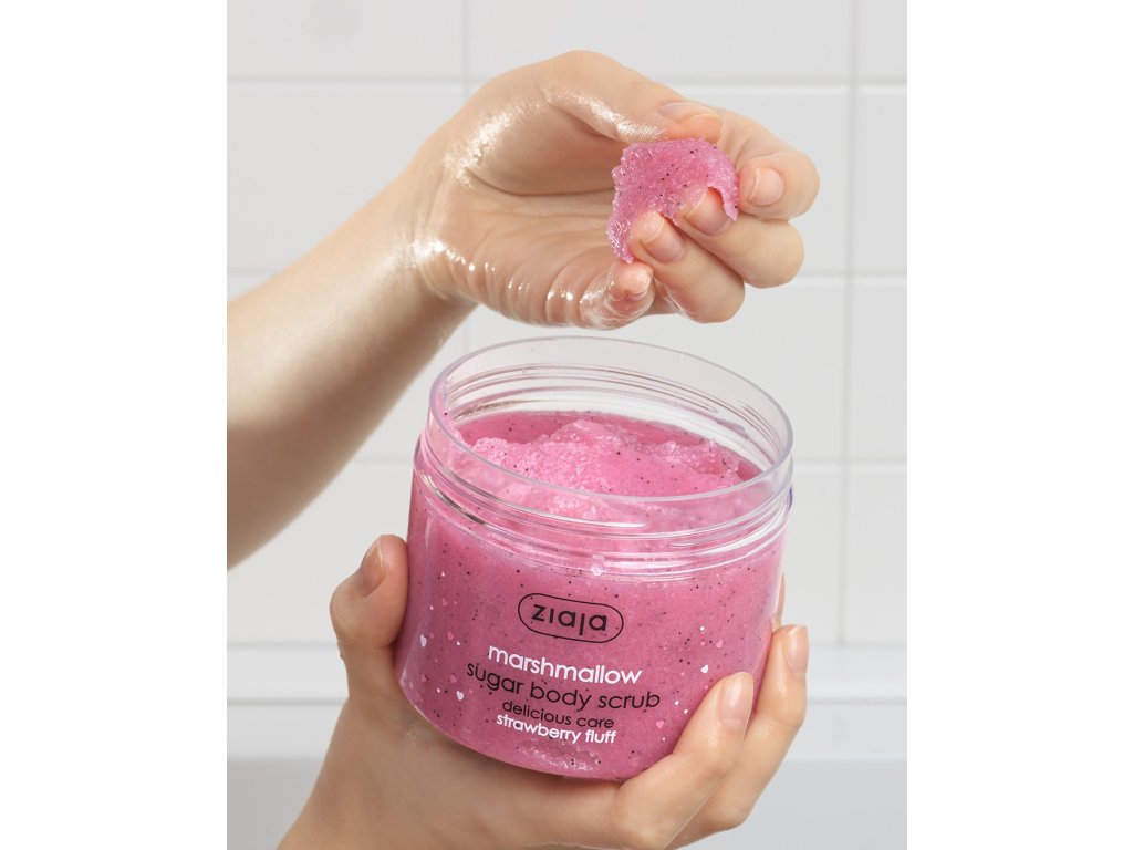 marshmallow SPRCHOVACÍ CUKROVÝ PEELING s vôňou jahodovej peny